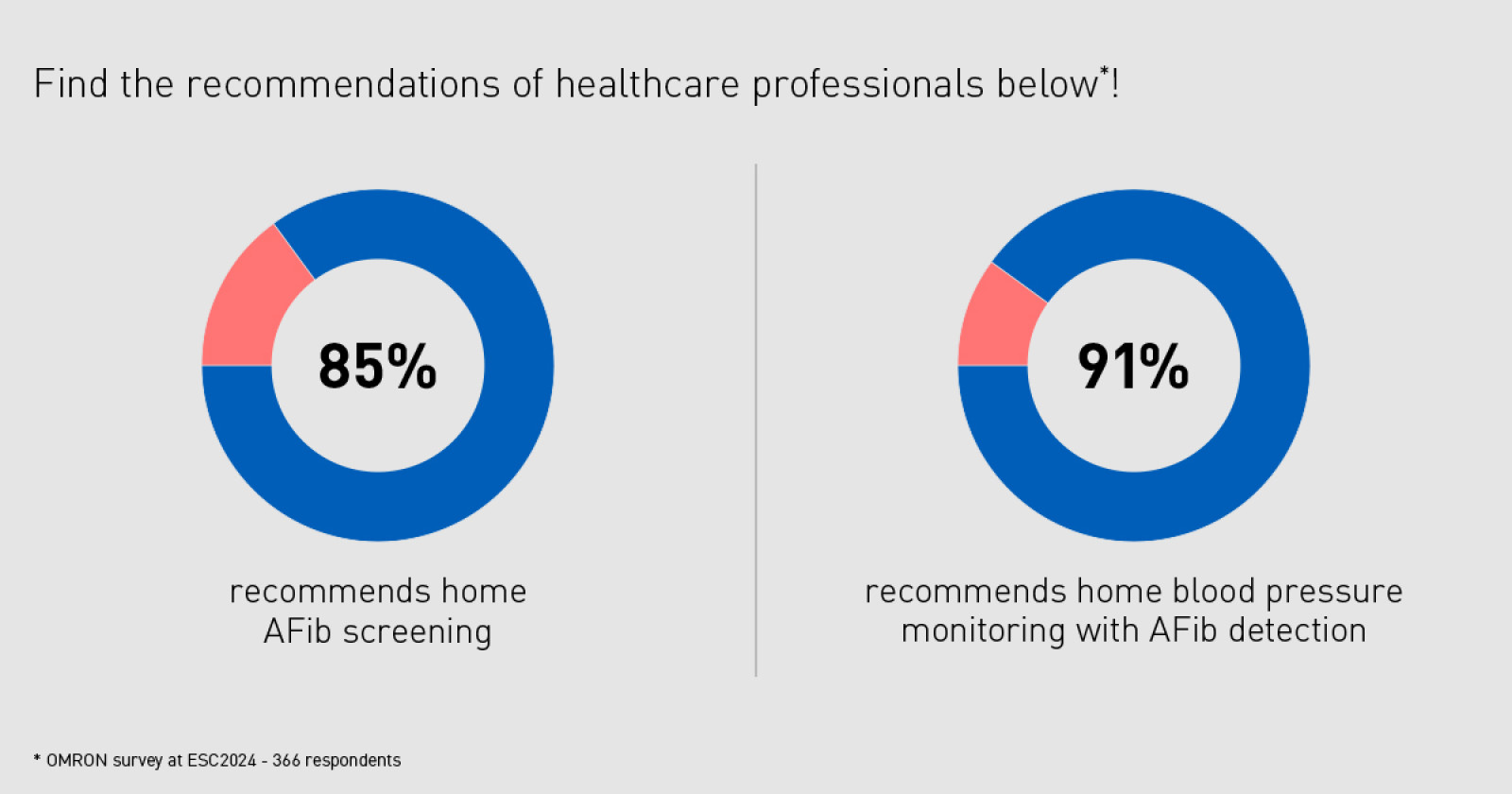 Během kongresu jsme mezi návštěvníky našeho stánku provedli průzkum, abychom zjistili jejich názory na dvě klíčová témata: domácí monitorování krevního tlaku a domácí screening fibrilace síní (FS). Ptali jsme se, zda by svým pacientům doporučili domácí monitorování krevního tlaku, zda by podpořili výrobky OMRON, zda podporují domácí screening AF a zda by pacientům doporučili používat tlakoměr s funkcí detekce AF.